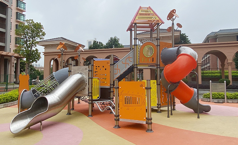 • 兒童戶外游樂設備室外大型不銹鋼兒童滑梯|佛山東湖洲房地產小區游樂設施案例